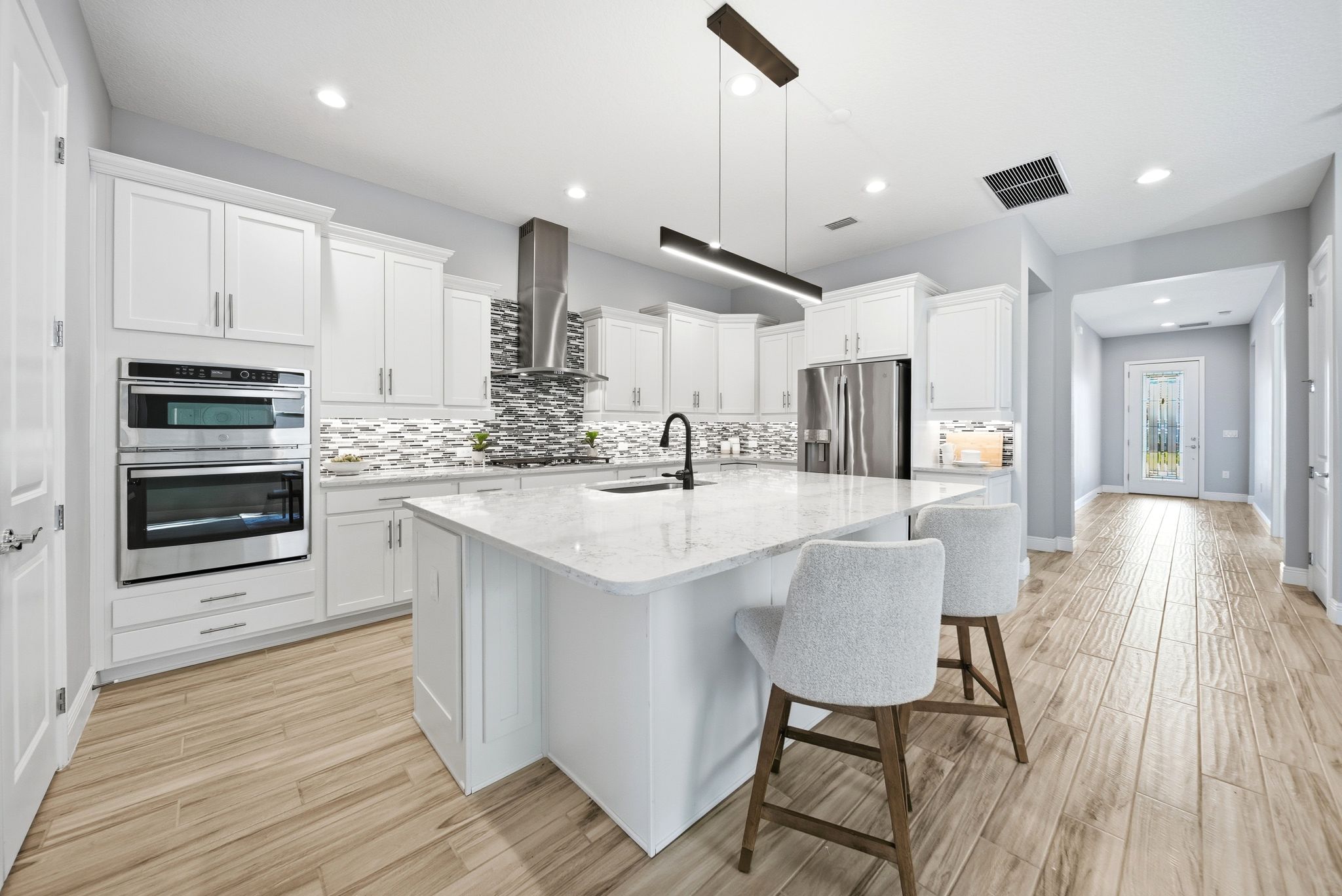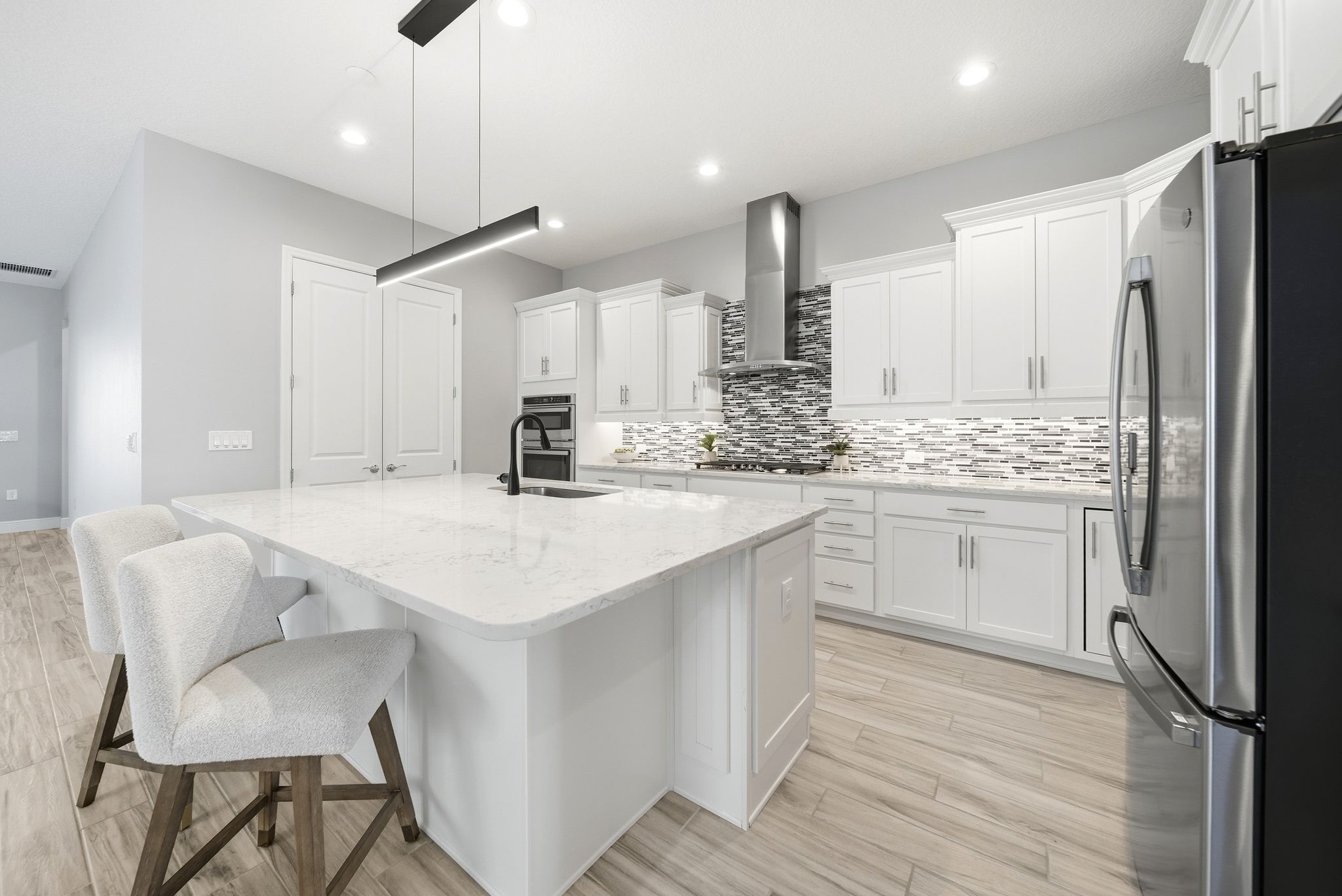 Welcome to 15047 Sunstar Way in Winter Garden, a striking pool home, designed for families who crave space, comfort, and luxury. With two full primary suites, five spacious bedrooms, six bathrooms, and backed-up by a GENERAC whole-house generator, this home delivers exceptional flexibility for multi-generational families, large households, or anyone needing room to grow and entertain. From the moment you enter, the airy layout, abundant natural light, and elegant finishes set the tone for a home that is both sophisticated and deeply livable. The heart of the home is the expansive great room, enhanced by a tray ceiling and impressive 12-foot sliding glass doors that create a seamless connection to the outdoor living area. The ultra-gourmet kitchen is a true showpiece, offering double ovens, upgraded appliances, quartz countertops, staggered cabinetry, soft-close drawers, under-cabinet lighting, a large walk-in pantry, and an oversized island perfect for gatherings and meal prep. A dedicated office provides privacy and functionality, ideal for working from home without sacrificing space elsewhere. Stepping outside feels like arriving at your own private retreat. With no rear neighbors, you’ll enjoy quiet mornings, peaceful evenings, and year-round privacy. The extended saltwater pool sits within a spacious screened cage complete with built-in lighting for nighttime enjoyment. The resort-style outdoor kitchen elevates entertaining with natural gas appliances, including a built-in cooler, griddle/flat top, stovetop burner, refrigerator, grill, and two mounted TVs, making it effortless to host everything from family dinners to game-day parties. Beautiful paver surfaces extend across the front porch, rear porch, pool deck, and driveway, creating a polished and cohesive exterior look. A dedicated pool bath adds convenience for swimmers and guests alike. Upstairs, the large loft provides a secondary living area and includes a kitchenette with direct wiring to the panel and its own refrigerator, offering excellent flexibility for guests, teens, or extended family. Custom blinds throughout the home, along with upgraded lighting in the kitchen and dining areas, contribute to the home’s modern, comfortable atmosphere. Thoughtful enhancements further elevate this property beyond the standard. A whole-house Generac generator ensures uninterrupted power, while natural gas service and a tankless hot water heater provide consistent efficiency. Full-height tile in every bathroom, frameless shower doors, upgraded interior paint, and a beautifully finished laundry room with custom cabinetry and a built-in sink add elegance and practicality. Storage is plentiful with a large upstairs closet, convenient space beneath the stairs, and a three-car garage featuring overhead storage racks and a dedicated freezer outlet. Additional conveniences such as timed exterior outlets, rear floodlights, and an upgraded front door enhance daily living and curb appeal. With its spacious design, luxurious finishes, and exceptional indoor-outdoor living spaces, 15047 Sunstar Way offers a rare opportunity in Winter Garden. This home is built for families who love to entertain, who value privacy and flexibility, and who want every day to feel elevated. It’s a place where memories are created, celebrations come to life, and comfort is woven into every detail.
